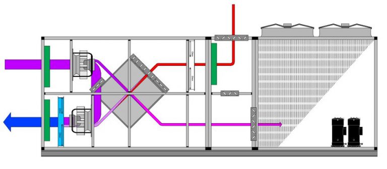 - Un échangeur de chaleur air-air haute performance (plus de 73 % conforme à ErP 2018) qui récupère non seulement l’énergie de l’air extrait avec une efficacité très élevée, mais joue également un rôle actif dans la déshumidification, comme décrit ci-dessous.