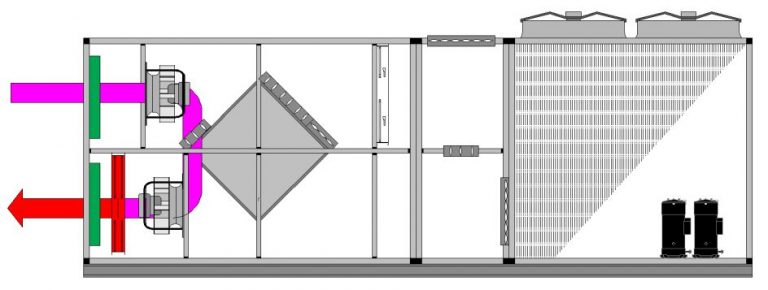 - Un système de déshumidification passive par séchage gratuit, mais aussi une section de déshumidification active effectuée par un évaporateur, alimenté par la pompe à chaleur intégrée.
