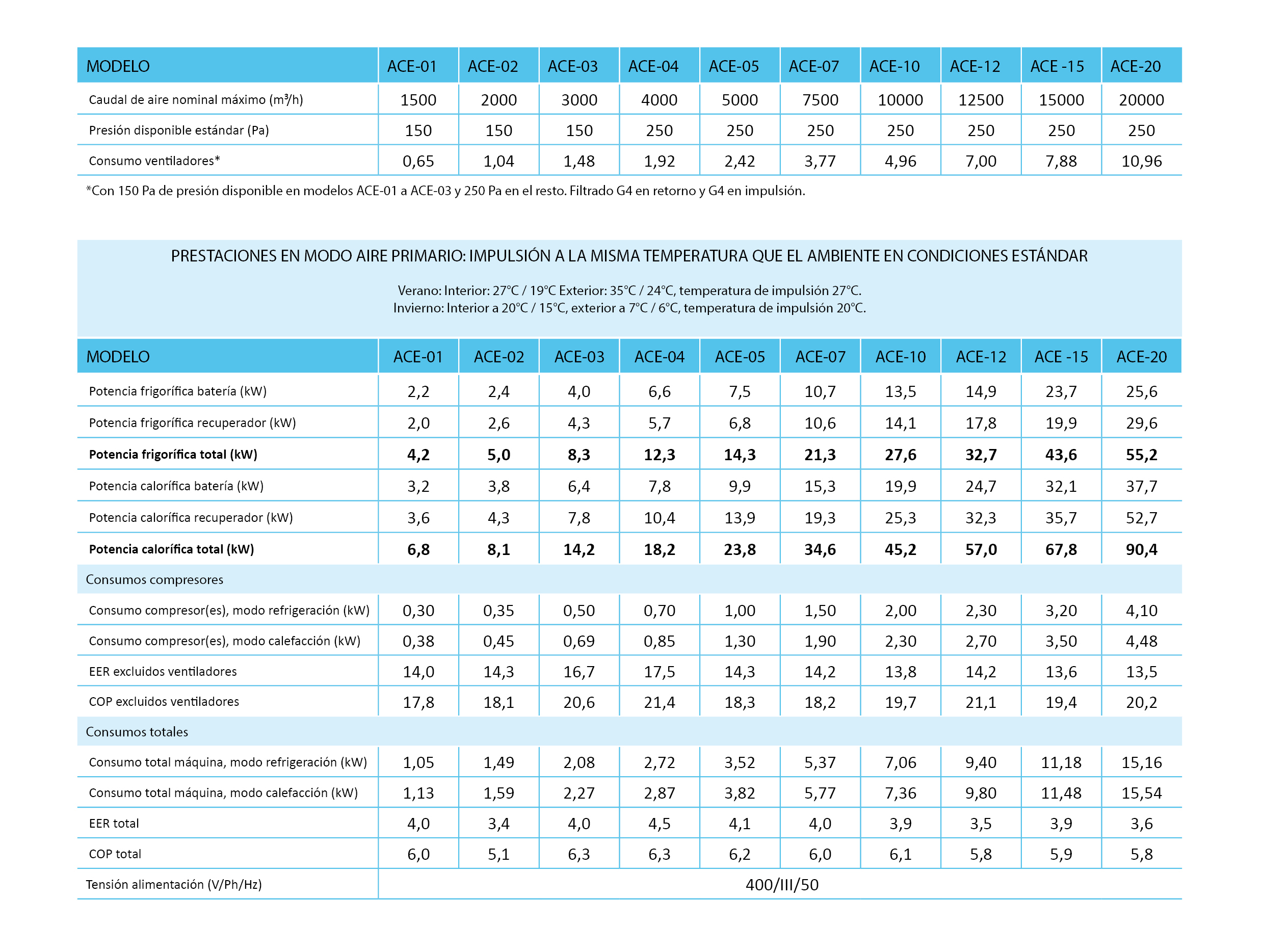 Borealis ACE: bomba de calor reversible autónoma para tratamiento de aire primario (100% aire exterior) con doble recuperación de energía: recuperador estático de flujo cruzado más recuperación frigorífica, dotada de compresores inverter para impulsión a temperatura constante.